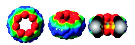 Electrostatic potential map (top and side view) of CB7, revealing the negatively charged carbonyl portals (in red)/ Shéma du potentiel électrostatique (vue de dessus et de côté) de CB7, révélant les portails carbonyles chargés négativement (en rouge).