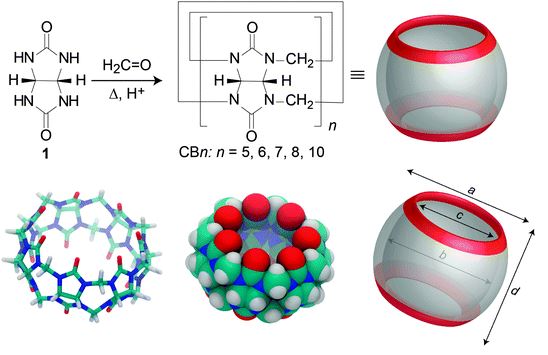 The defining structural features of the CBn family are their highly symmetric structure, with negatively charged carbonyl rims and a hydrophobic cavity. The electrostatic potential map of CBn visualizes the high electron density at the carbonyl oxygens and clearly illustrates their cation-receptor functionality. Their inner cavity, however, has neither functional groups nor electron pairs pointing towards the inside. It therefore cannot engage in hydrogen-bonding interactions, which – along with the non-dipolar nature of the macrocycle itself – provides an intuitive rationale for the high hydrophobicity of the cavity.