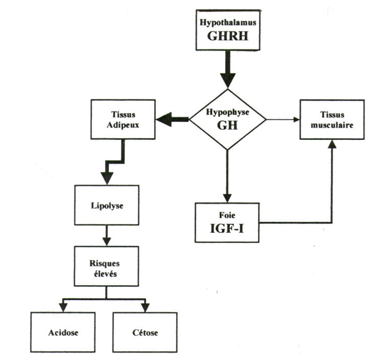 C'est ainsi que chez un individu en balance énergétique positive, la production hypophysaire de GH induit la production hépatique d’IGF-1 véritable activateur de la multiplication cellulaire et donc des productions animales et des capacités de performance.