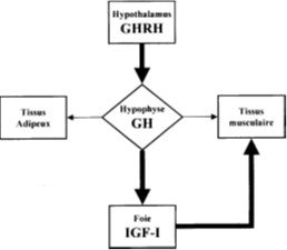 Dans les régulations endocriniennes des fonctions biologiques, l'axe somatotrope exerce un rôle central. Synthétisée par l'hypophyse, l'hormone de croissance (ou GH) interagit essentiellement avec son récepteur hépatique afin de produire le principal facteur mitogénique, l'IGF-1(Insulin Growth Factor-1)